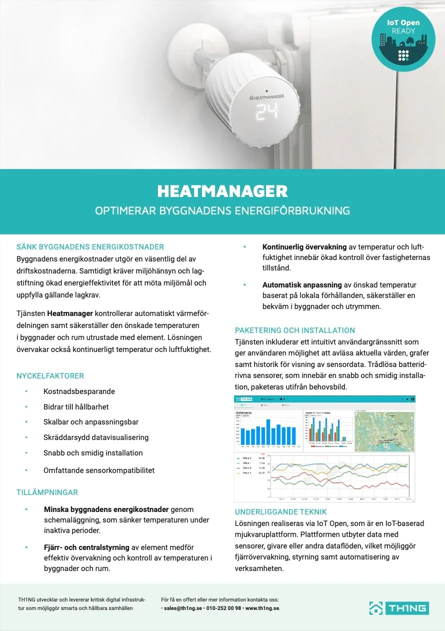 Tjänsten Heatmanager kontrollerar automatiskt värmeför- delningen samt säkerställer den önskade temperaturen i byggnader och rum utrustade med element. Lösningen övervakar också kontinuerligt temperatur och luftfuktighet.