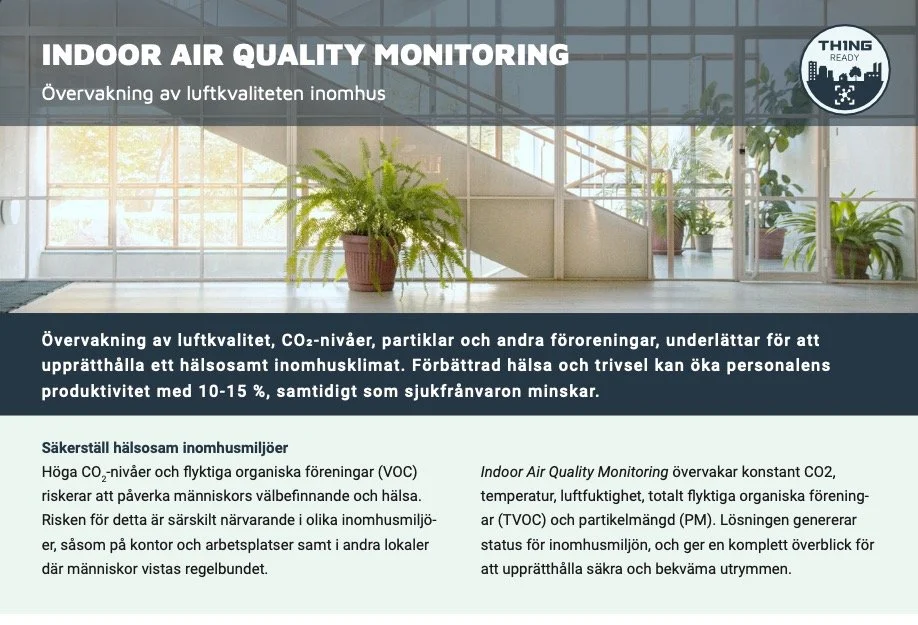Indoor Air Quality Monitoring övervakar konstant CO2, temperatur, luftfuktighet, totalt flyktiga organiska föreningar (TVOC) och partikelmängd (PM). Lösningen genererar status för inomhusmiljön, och ger en komplett överblick för att upprätthålla säkra och bekväma utrymmen.